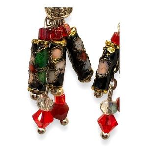 The earrings are made up of silver skulls, enamelled tube beads, Swarovski Crystal beads, glass beads, stainless steel chain and stainless steel hooks.