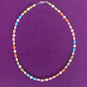 The beads are all high quality materials - the oval ones are painted wood, spacers are glass seed beads, pearls are glass as well.
