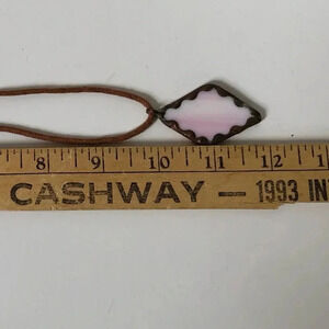 Cute pink slag glass in the shape of a diamond. Copper tone border with a brown fabric necklace and spring ring clasp. Non adjustable length as it is.