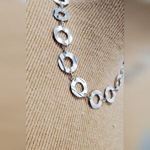This is my upcycled and repurpose from vintage silver-toned inter-connected disc shaped links. Set necklace with lobster clasp closure and extender chain. Pierced dangled earrings and bracelet with toggled clasp closure.