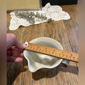 Charming handcrafted studio pottery piece that can be used as a small creamer or whisking bowl. Made of speckled stoneware with a hand-painted brushstroke design in earthy tones. The rustic aesthetic and sculpted handle make it both practical and decorative.