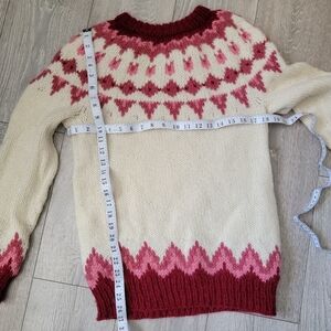 Handmade Sweater in good condition. Not sure of size so I took a picture of approx measurements. Not sure of yarn makeup I am guessing an acrylic blend.