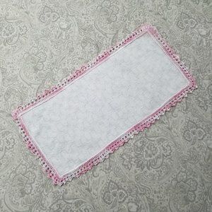 Handmade rectangle decorative mat. Lace body with pink crochet boarder.