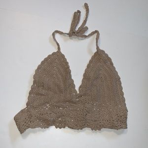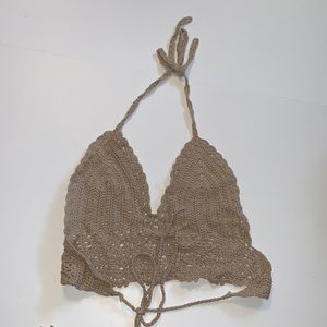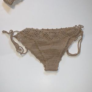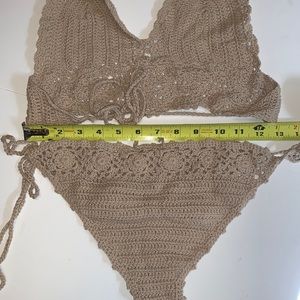 New handmade tan crocheted bikini with adjustable ties in women’s size extra small (XS).