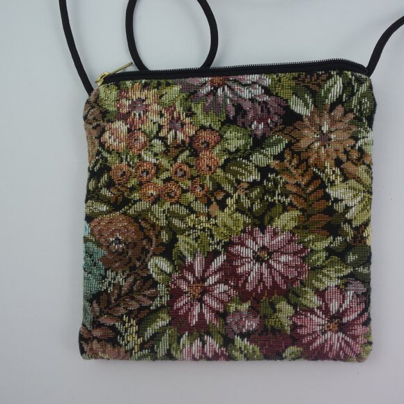 Cute and practical crossbody bag with a woven tapestry floral exterior and black cotton fabric interior.