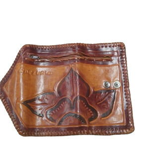 Handmade brown leather wallet from Venezuela. Leather is multi-tones of brown and tan. Tooling, embossing, engraving and stitching.
