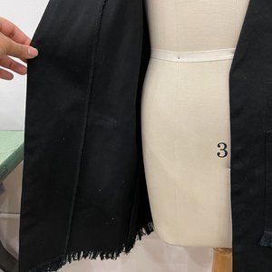 This vest was made for a show in 2018. I am sad to see it go but I will need space for 2022 for my first MTO collection. This long coat is a labour of love and craftsmanship. Handmade by me, it took 16 hours from drafting the patterns to making the final sample. Made in a straight cut for a UNISEX fit. The sleeve is a tailored sleeve in a slight angled hem. Two front pockets with frayed edges and the hem is hand frayed as well. No lining only used facings.