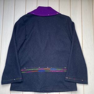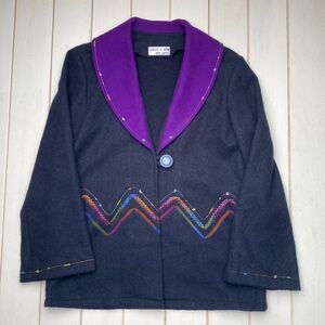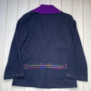 I adore the flair of this piece. That purple collar is to die for! Single button closure. Gorgeous zigzag pattern sewn below button. sleeves and Bell sleeves and with design.