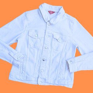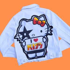 • Handmade, Upcycled Hello Kitty/Kiss White Denim Jacket Size M