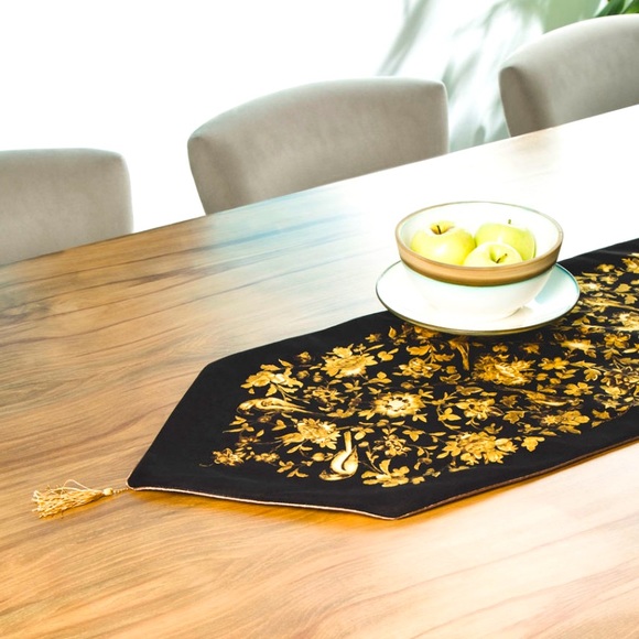 Add an artful touch to any tablescape with an elegant hand-made velvet runner. Available in various modern designs to match well with all types of tabletops, from the natural to adventurous. Elements inspired by rich Persian traditional arts like calligraphy and miniature keep the subtle camouflage pattern of classical table runners sophisticated.