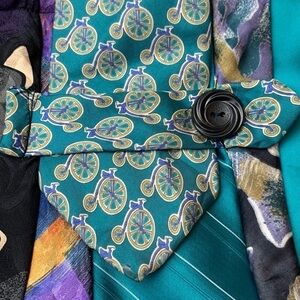 Unusual, one-of-a-kind handmade purse made with vintage silk ties in excellent pre-loved condition. Teal and purple with various abstract and bicycle patterns. Made by Family Ties.