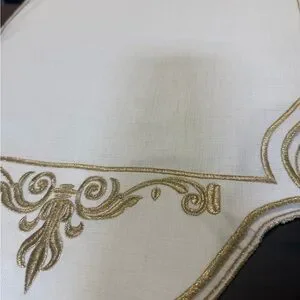 Enhance your dining experience with this elegant white and gold table runner set. Perfect for adding a touch of sophistication to any meal. Perfect for Christmas, a fancy dinner, holiday gatherings.