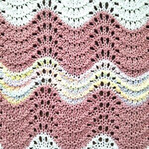 White with two wavy pink stripes across the middle and a pastel multicoloured stripe in the centre