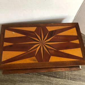 Lovely handmade wooden box with intricate design. This lovely box is likely made from Cedar (in addition to other types of woods). Unsure on exact age but it’s vintage for sure.