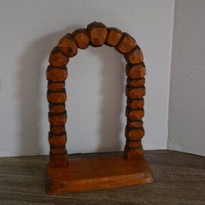 Hand carved wood (possibly Maple or something similar) with a rich chestnut stain. Very good quality. Very detailed. Looks like boulder rocks with a base which is the shelf. Hangs on the wall. Display anything and everything on this stunning shelf! It is truly one of a kind.