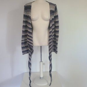 This gorgeous handmade wrap sweater features stormy sky colours, generous wrap ties & is very stretchy.