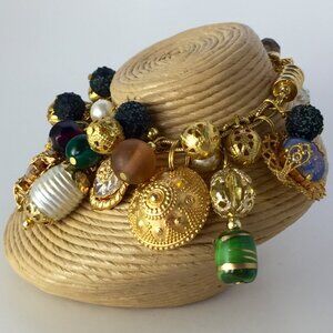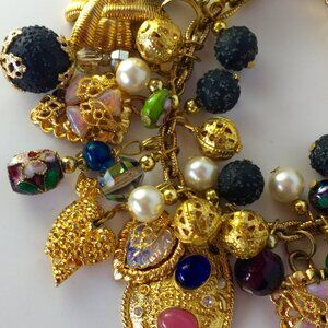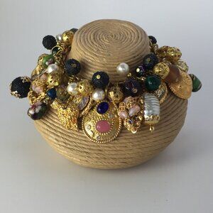 This Elegant Charm bracelet is loaded with charms and jewelry pieces. It boasts plenty of beads: cloisonné, crystal, wood, faux pearl, crystal, acrylic, metallic. A handful of the charms contain opalescent gemstones... The bracelet fastens with a strong magnetic clasp for easy wear.
