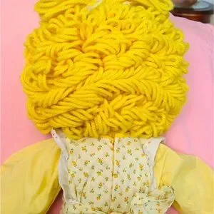Soft rag doll with bright yellow yarn hair. Red heart cheek details and embroidered face. Yellow floral dress with heart applique. Cute collectible toy. Ready to display or gift.