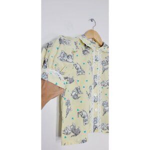 Handmade Yellow Set Gray Cats Print Button Down Blouse Puffy Sleeves Skirt Set