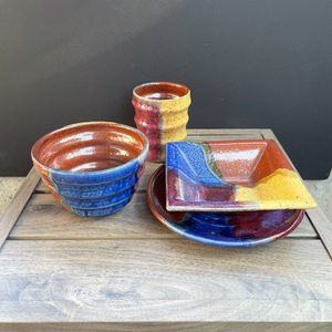 Handmade and Painted Ceramic Plates, Bowl, and Cup