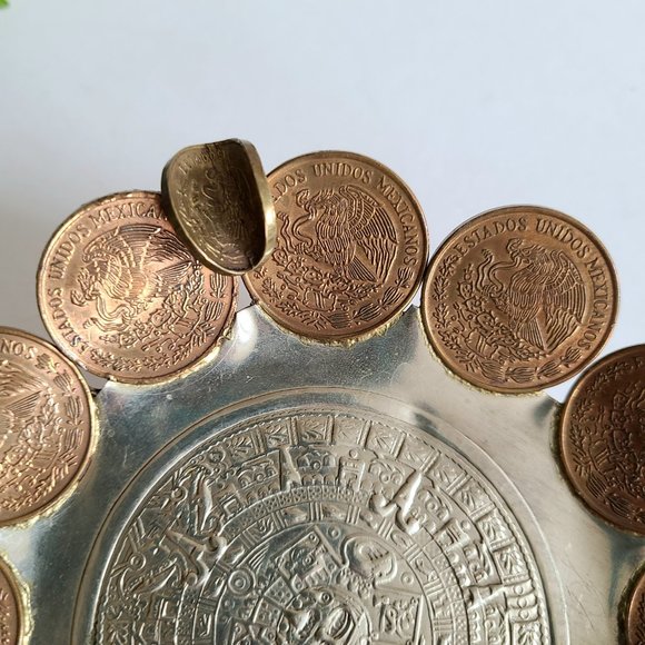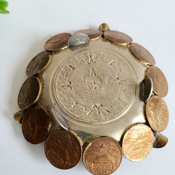 Handmade ashtray with coins and Mayan calendar.