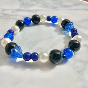 Handmade blue, white and black bracelet with pearls, glass and acrylic beads