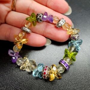 This bracelet is a colorful and vibrant piece of jewelry, handmade with a variety of gemstone beads and decorative elements.
