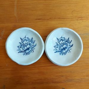 Pair of handmade ceramic mugs and saucers. Blue and white (really more of a soft grey) with gold rim. Excellent condition, no chips. As pictured, the style is perfectly imperfect. Would make a lovely gift for the tea drinker in your life or can be used as accent pieces.