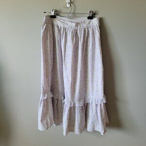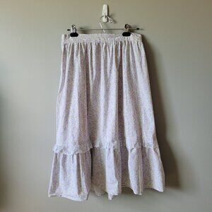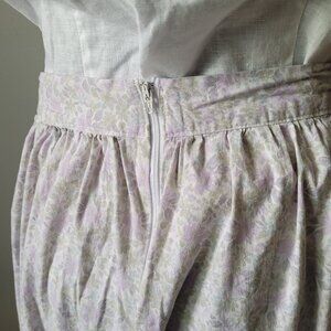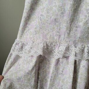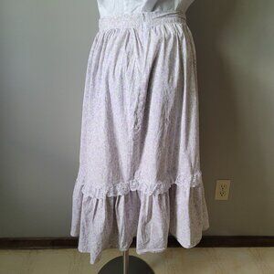 Soft purple and grey floral cotton skirt with ruffle hem and lace detail. Side zipper.