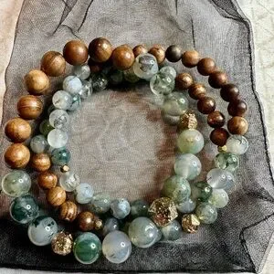 Set of 3 gemstone bracelets Mix of wood and gemstone beads with gold accents Stretchy band Comes with black sachet bag for storage