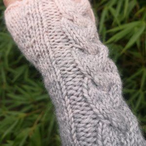 Handmade Knittted Braid Seamless Fingerless Texting Gloves, Armwarmer Color Pink Gray gradient Size One Size, length 9 1/2" unstretched * Handmade in BC, Canada * Made of 78% Acrylic / 22 %Wool * Machine washable cold, dryer low