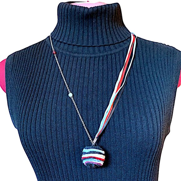Style: - Long necklace - ruban - red blue white black beads - Silver tone chains - Recycle fabric pompom Pendant