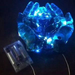 Handmade by me from epoxy resin, local beach-combed shells, little crab, corals, beach pebbles and fairy lights. Takes 3 AA batteries.