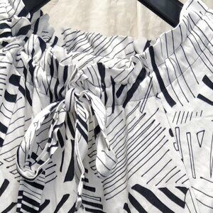 3/4 sleeve maxi dress with flowing skirt and a relaxed fit. Handmade from dark navy/white abstract patterned cotton. Ruffled tie-up collar.