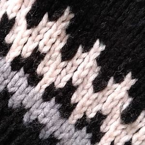 Cozy handmade turtleneck sweater. The sweater is either very dark blue or black. The accent pattern is white and light blue. There are no sizing tags but the woman it was made for wears a large.