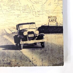 Image pictures a vintage car overlayed on a vintage map of California. Sepia toned.