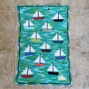 Handmade Crochet Sailboats Baby Blanket 23"x34" Nautical Blue Green Afghan Throw