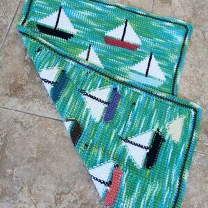 Handmade Crochet Sailboats Baby Blanket 23"x34" Nautical Blue Green Afghan Throw