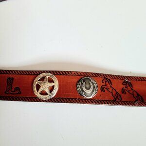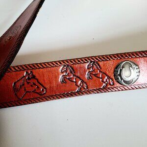 Handmaid McNeill leather belt Western design with horses and metal details.