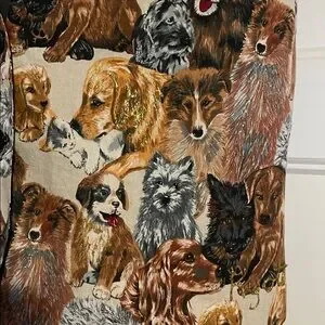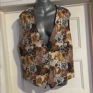Stylish vest with a playful dog print. Features a variety of dog breeds in a colorful design. Perfect for adding a fun touch to any outfit. Measurements pit to pit 21 inches.