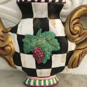 Black and white checkered teapot with pink, purple, green and gold accents. Hand painted vintage chalk ware metal hanger on the back. I painted it with acrylics and sealed it with a matte finish. Approximately 7.5” by 7.5” at the widest points. Cute kitchen decor.