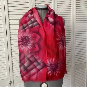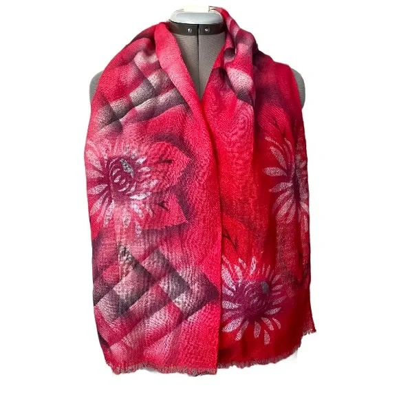 Lightweight woven wool scarf with Hand-painted geometric and floral design.