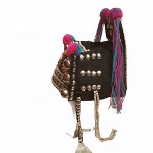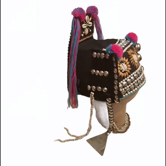 Traditional thai mountain Akha hat with handstitched metallic, shell, bead, bells and yarn details. Normally worn by women and girls from these high elevation villages. Sorry about the weird patchy looking areas of black in pics, it's not like that in person, my image editor just did that to it when I removed the background. EUC