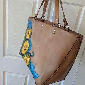 This is a lovely large hand tooled and painted leather tote bag. This bag gives me Joshua Tree vibes 🌵🏜️🌼 I love how it bag turned out. As common with this type of new leather it has some scuffs but It will only rough up and look cooler and more beautiful with time.