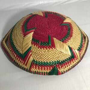 Handwoven Basket Woven Grass Red Green Beige Natural Dye Loop Handles 12"