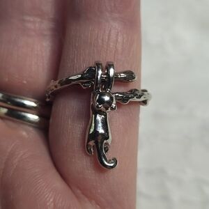Charming silver toned ring featuring a playful cat design. Perfect for cat lovers.