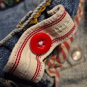 Hanna Andersson girls size 100 or 4 medium wash with flower ribbon on leg adjustable waist, appliqued patch on knee, some fade, 5 pocket, VGUC