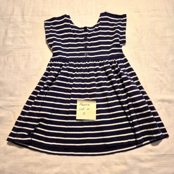 Hanna Andersson girls size 110 or 5 dress, blue & white stripe sleeveless , 4 button front closure, navy with white stripe, EUC