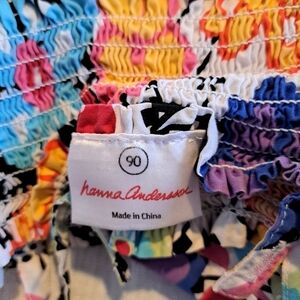 Hanna Andersson girls size 90 of 3T floral dress has stains but they blend in pretty well, probably ice cream, priced accordingly, gathered elastic top, 2 button holes on straps for adjusting