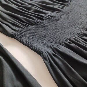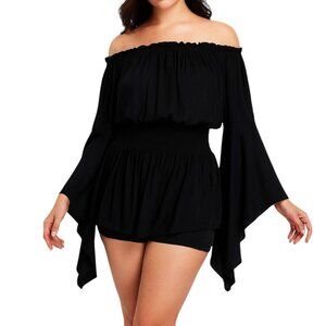 A feminine on-off-shoulder blouse in black. Lightweight soft fabric with stretch at the smocked waist and elastic neckline. Equally striking worn on its own or layered under a structured corset or statement belt. Suitable for summer, spring or fall, winter layering. Like new, excellent condition.